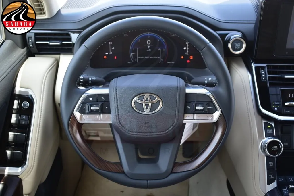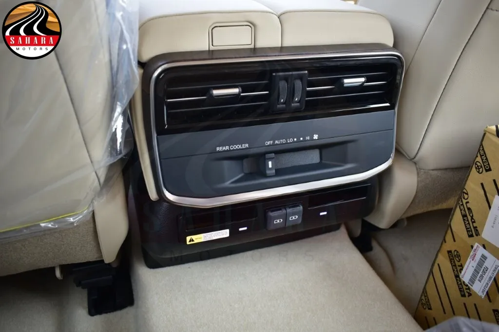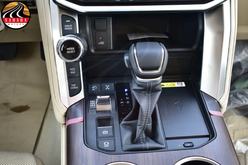 The LC 300 GXR V 3.3L features luxurious leather seating, a leather and wood steering wheel, and a power passenger seat with synthetic leather. Safety is prioritized with multiple airbags, an anti-theft system, and advanced parking sensors. Comfort is enhanced by a moon roof, wireless charging, and a rear seat entertainment system. The exterior includes stylish LED lighting, aero-designed mudguards, and protective moulding. Additional conveniences feature an auto suction door, power back door, and an overhead console with moonroof. This model combines sophistication with practicality for an exceptional driving experience.