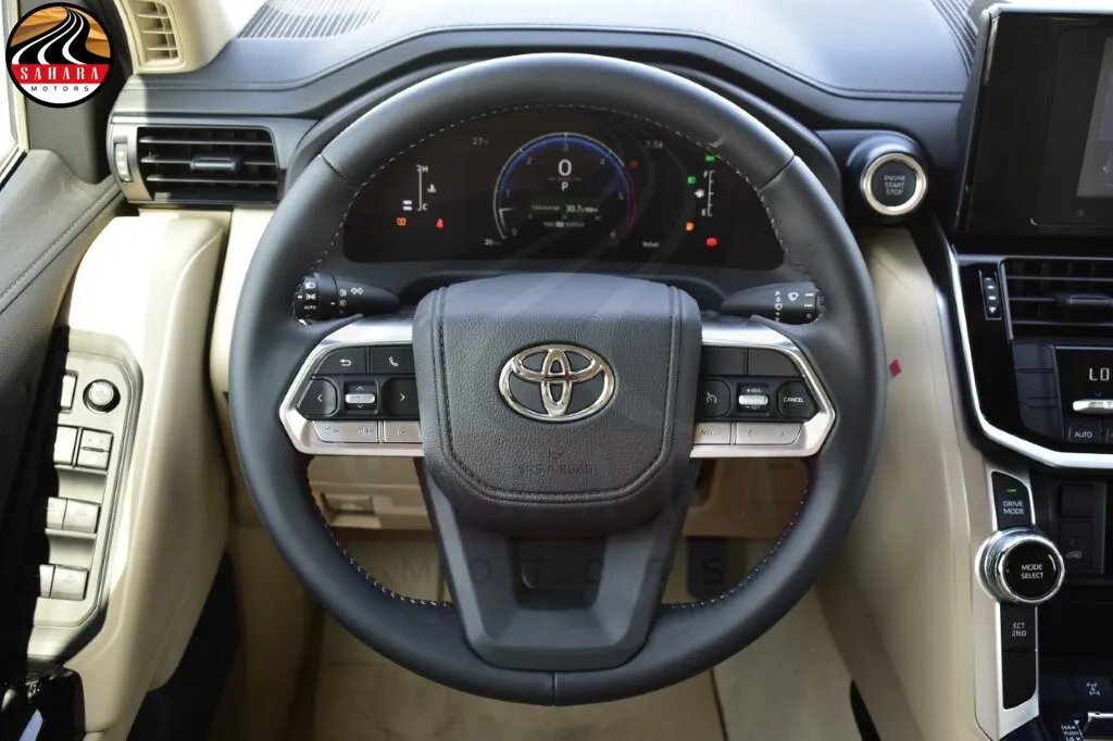 The 2025 Toyota Land Cruiser 300 GXR-G1 boasts an array of luxurious and advanced features, enhancing both comfort and performance. It includes tri-zone air conditioning and plush fabric-suede seats, with the driver’s seat being power-adjustable for tailored comfort. A sun/moon roof with jam protection enhances the driving experience, while the piano wood grain package and leather-wrapped steering wheel add a touch of elegance. Keyless push start, an Optitron meter with a multi-information display, and an electric parking brake with brake hold provide convenience at your fingertips. For entertainment, the vehicle offers a 9-inch audio system with AM/FM, FM sub, DAB, and roof-mounted options, complemented by six speakers. Apple CarPlay and Android Auto ensure seamless connectivity. Safety features include an anti-lock braking system (ABS), brake assist (BA), emergency stop signal (ESS), and dual front and knee airbags, providing peace of mind on the road.