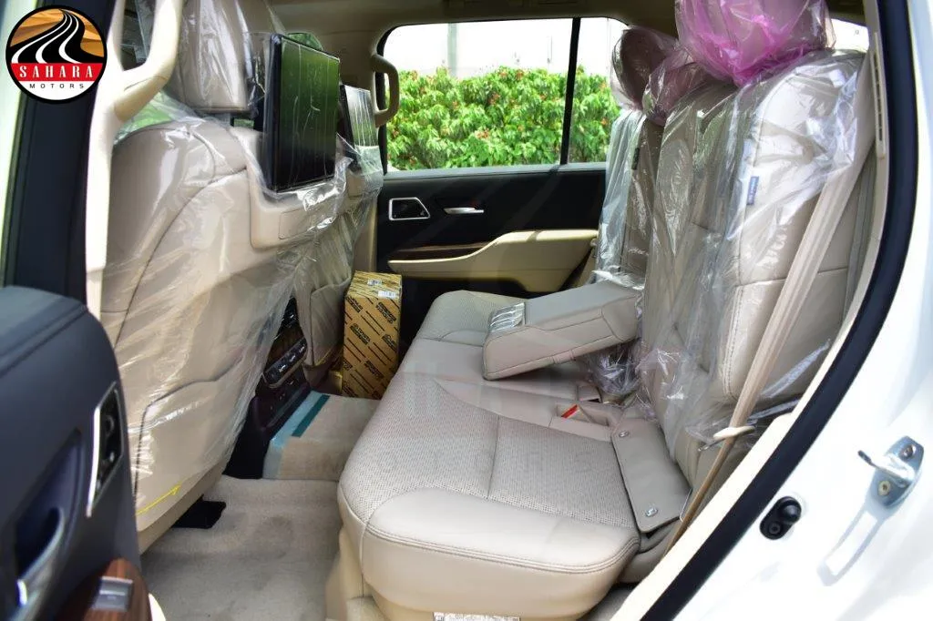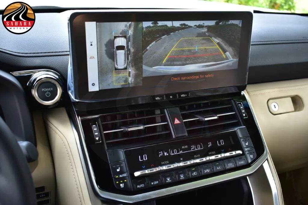 The 2025 Toyota Land Cruiser 300 Hybrid VX features an array of exterior highlights, including striking 20-inch alloy wheels and advanced LED projector headlights with auto leveling. Additional features such as dark chrome side molding, illuminated side steps, a rear bumper chrome step guard, a towing hitch, and silver integrated roof rails complete its robust exterior design. Inside, the Land Cruiser offers premium leather seating, with powered front seats featuring memory for the driver and ventilation for both the front and second row. Entertainment options include a 12.3-inch integrated display audio system with navigation, Apple CarPlay, and a 14-speaker JBL audio system. The back seat entertainment system offers two screens and headphones, enhancing the passenger experience with USB and HDMI ports available throughout the vehicle.
