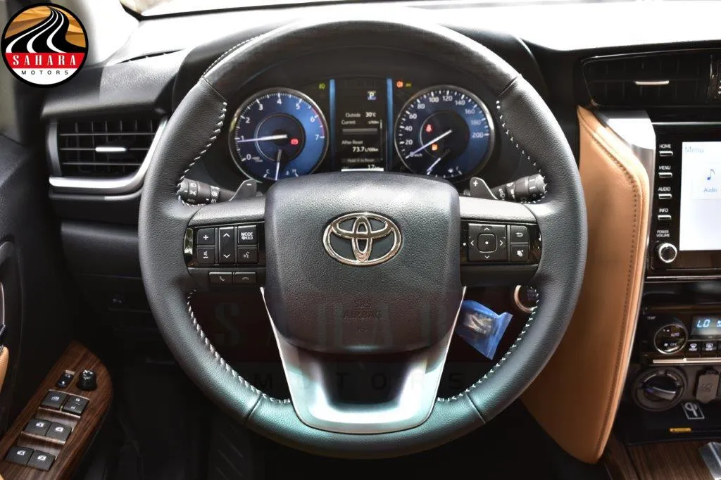The 2025 Toyota Fortuner GXR Limited comes with an impressive array of features designed for comfort and convenience. It includes an automatic air conditioner and an engine start/stop button for easy access. Experience enhanced driving with paddle shifters and a differential lock for better traction. The interior boasts elegant wood panels, while the exterior features auto retractable side mirrors, chrome door handles, and chrome side moldings for a touch of sophistication. Safety and functionality are prioritized with a rear view monitor, rear camera, and rear bumper step guard. Enjoy added convenience with fast charging USB ports, LED front fog lamps, a rear lamp garnish, and a rear license plate garnish, making every journey enjoyable and stylish.