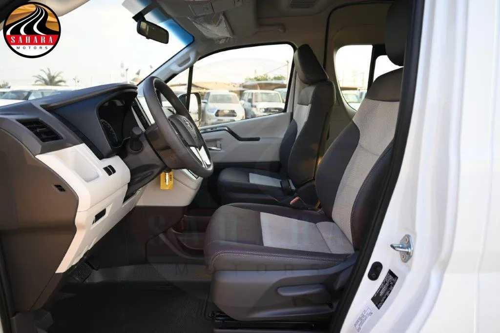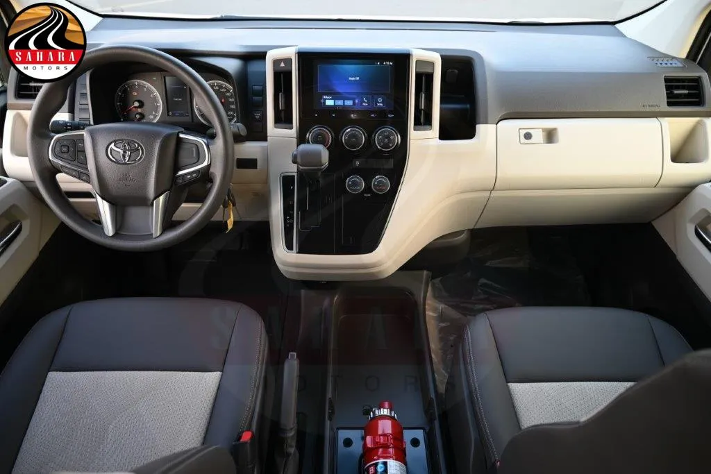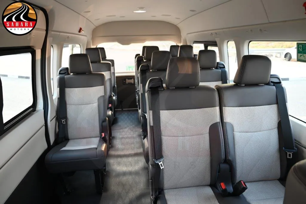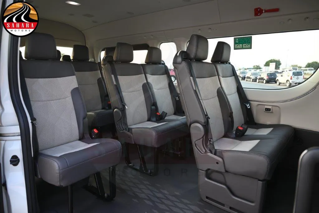 It includes advanced safety systems such as ABS, VSC, BA, ESS, TRC, and Auto LSD, complemented by dual front airbags. The stylish exterior features color-keyed bumpers and door handles, a chrome front grille, and halogen headlamps, while power-retractable mirrors enhance visibility.Inside, it comfortably seats up to 13 passengers with durable fabric and vinyl leather seats. Key features include an AC/heater system with rear controls, a day/night inner rearview mirror, and a multi-information display. Entertainment options consist of an AM/FM radio, rear USB ports, and a Bluetooth stereo system. Additional conveniences include keyless entry, a tire pressure monitoring system, and adjustable intermittent wipers, making the Hiace a reliable choice for families and commercial use.
