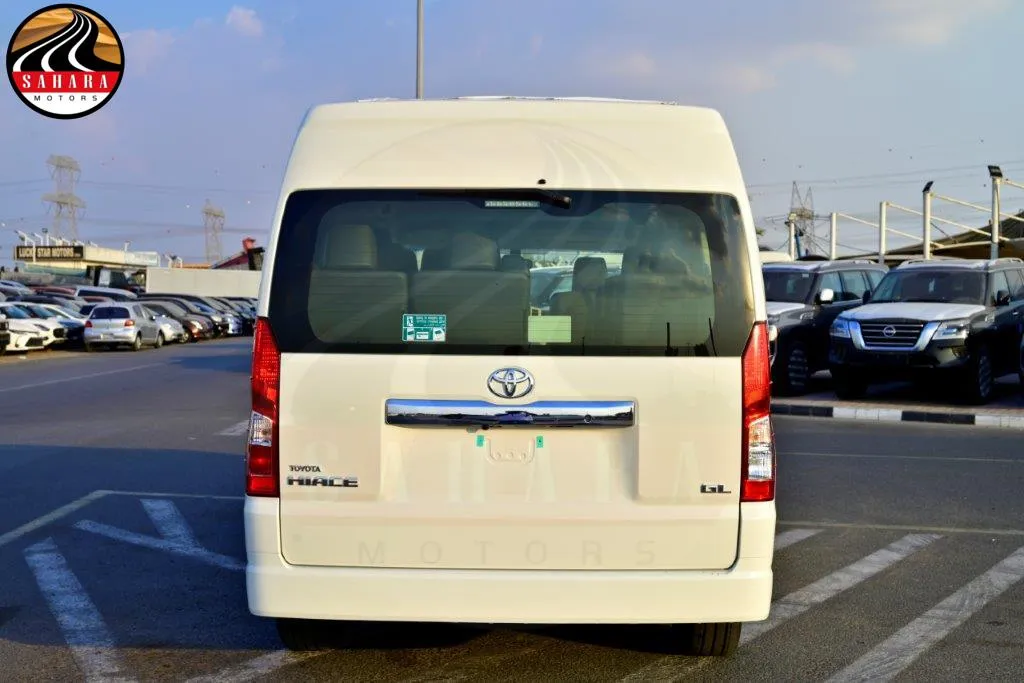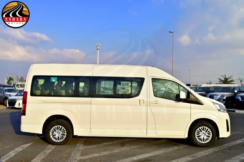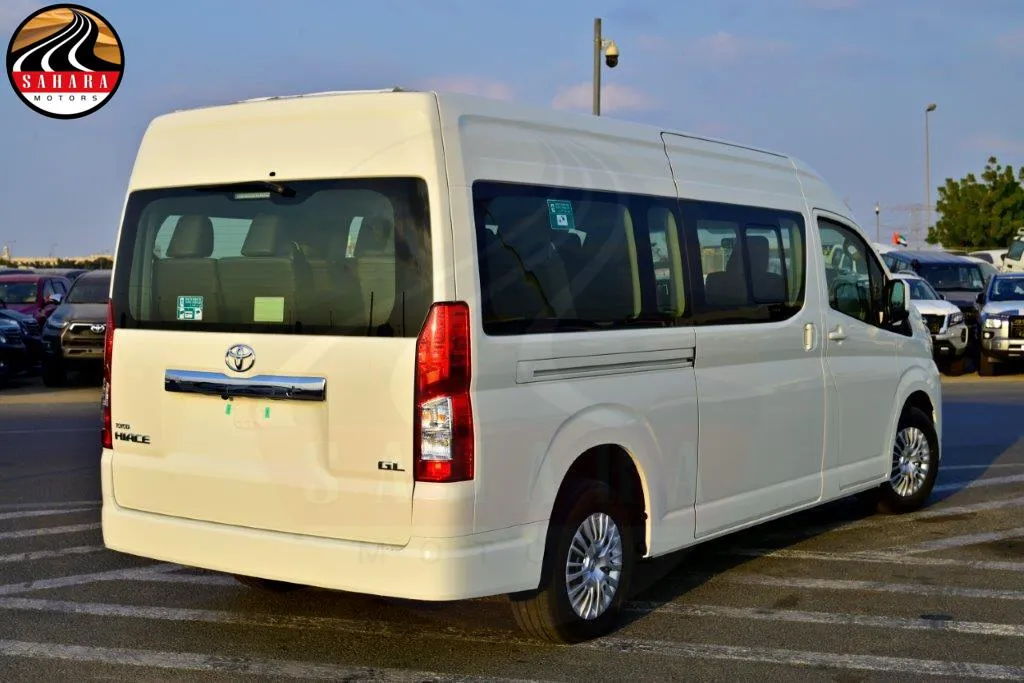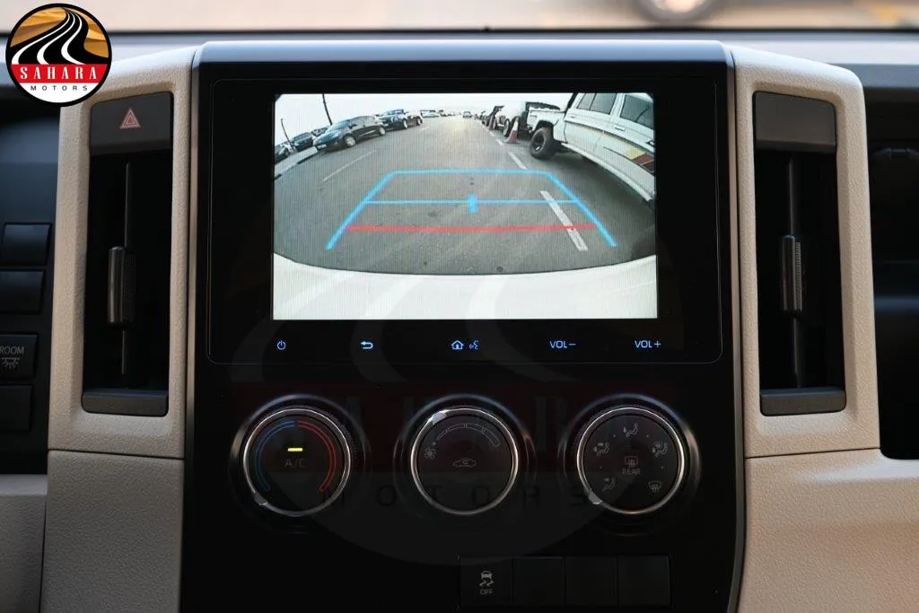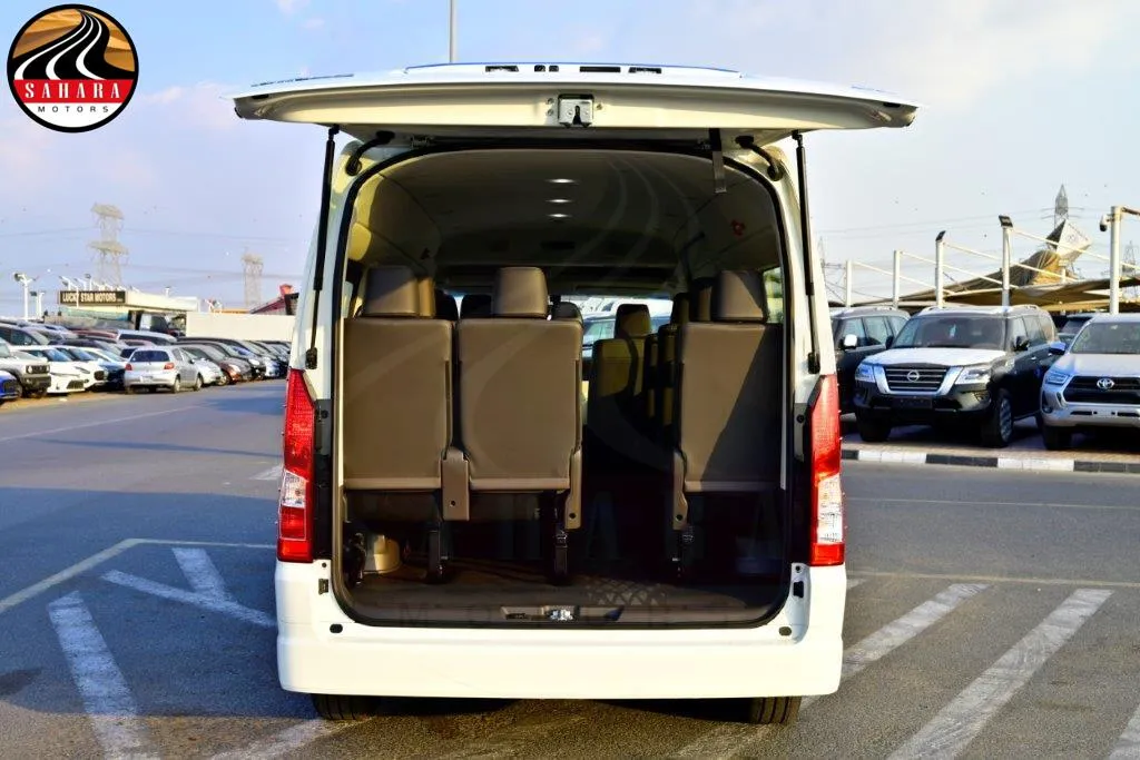 It includes advanced safety systems such as ABS, VSC, BA, ESS, TRC, and Auto LSD, complemented by dual front airbags. The stylish exterior features color-keyed bumpers and door handles, a chrome front grille, and halogen headlamps, while power-retractable mirrors enhance visibility.Inside, it comfortably seats up to 13 passengers with durable fabric and vinyl leather seats. Key features include an AC/heater system with rear controls, a day/night inner rearview mirror, and a multi-information display. Entertainment options consist of an AM/FM radio, rear USB ports, and a Bluetooth stereo system. Additional conveniences include keyless entry, a tire pressure monitoring system, and adjustable intermittent wipers, making the Hiace a reliable choice for families and commercial use.