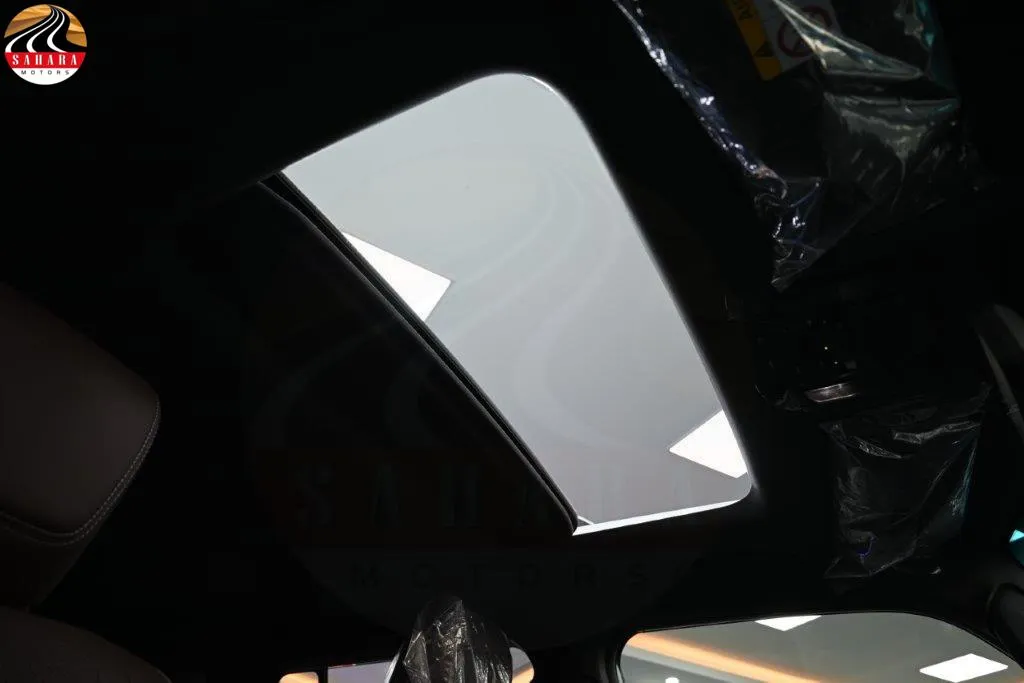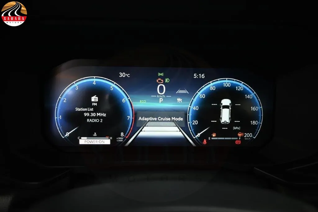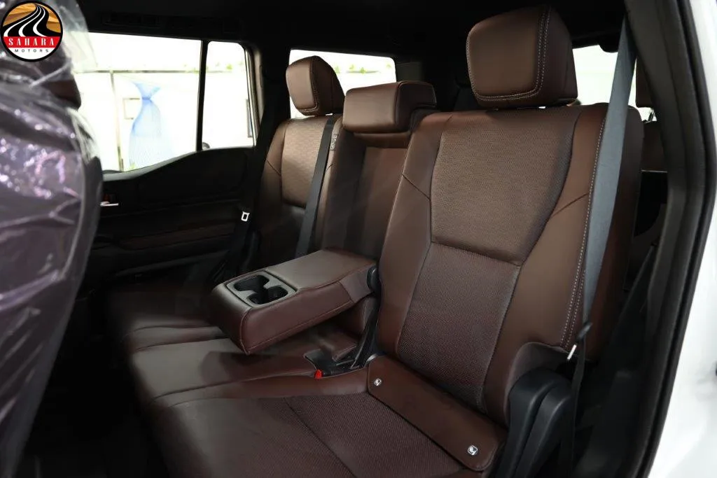 The 2024 Toyota Land Cruiser 250 Prado Adventure First Edition exudes a bold and rugged presence thanks to its extensive list of exterior features. Leading the way are the striking LED headlights with daytime running lights, complemented by an automatic headlight leveling system that ensures optimal illumination. The Prado rolls on 18-inch alloy wheels that complement the sleek silhouette. Enhancing the open-air experience is a power sliding sunroof, while the integrated roof rails provide versatile cargo carrying capabilities. Adding a sporty touch is the rear roof spoiler. The front grille is finished in a distinctive grey hue, contrasted by silver paint accents on the front bumper guard. For a bold, rugged appearance, the hood and back door garnishes are finished in a sophisticated black. Providing effortless access, the Prado is equipped with a power-operated back door and hatch, along with smart keyless entry functionality.