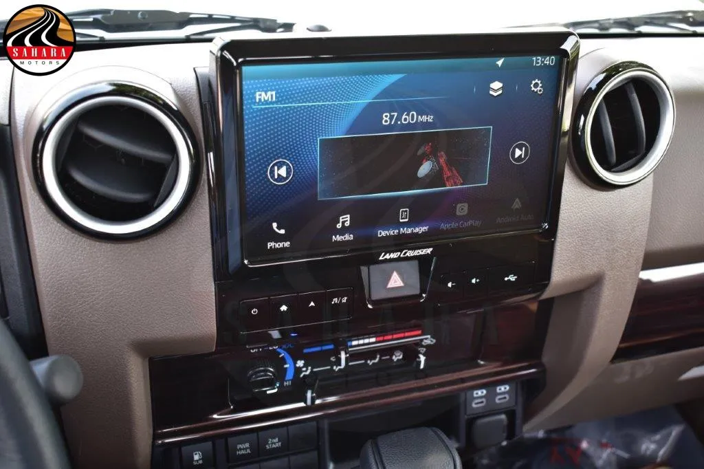 Safety and convenience are paramount in the Land Cruiser Single Cab Pickup. It is equipped with features such as remote central door locking, power windows, cruise control, and a rear camera for effortless maneuvering. The front and rear differential lock, along with the down-hill assist control and hill-start assist control, enhance off-road capabilities. The Toyota Safety Sense (TSS) suite includes pre-collision system, lane departure alert, and automatic high beam, providing an added layer of safety and peace of mind. The Optitron speedometer with a 4.2-inch MID provides clear and concise information, while the center console, front cup holders, and floor mats add convenience to your journey. The 9-inch touch screen display audio system supports wireless Apple CarPlay, ensuring seamless connectivity and entertainment on the go.
