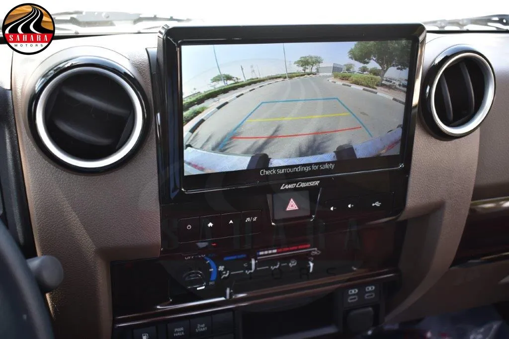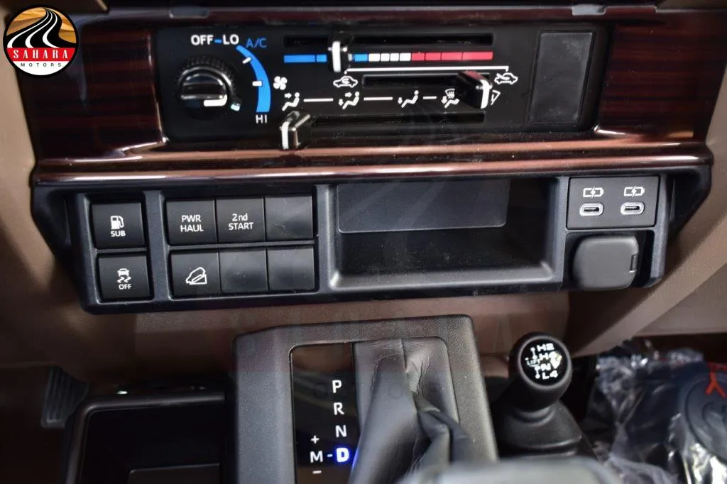On the exterior, the Land Cruiser Single Cab Pickup boasts a striking presence with 16-inch alloy wheels, LED headlights, and LED daytime running lights. The front black bumper houses an electrical winch, ready to assist in demanding situations. Over fenders and a rear bumper provide additional protection, while the Land Cruiser heritage emblem proudly adorns the front fender. With features like power side view mirrors, side stripes, and a bed liner, this pickup combines functionality and style seamlessly. Inside the cabin, you'll find a comfortable and well-appointed space. The leather seats offer a touch of luxury, complemented by a wood grain effect on the dashboard and leather-wrapped steering wheel.