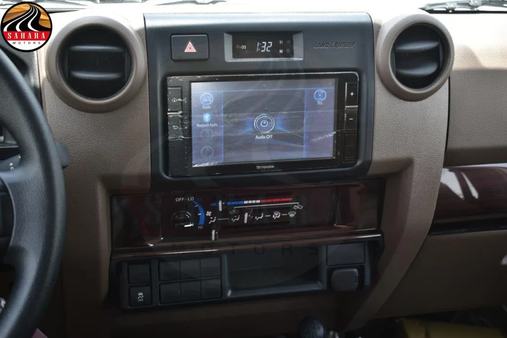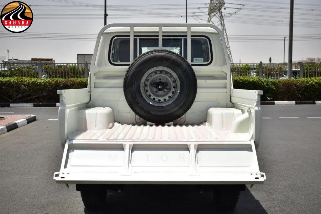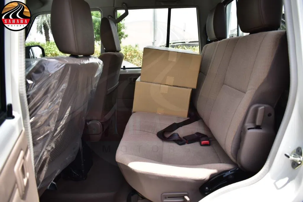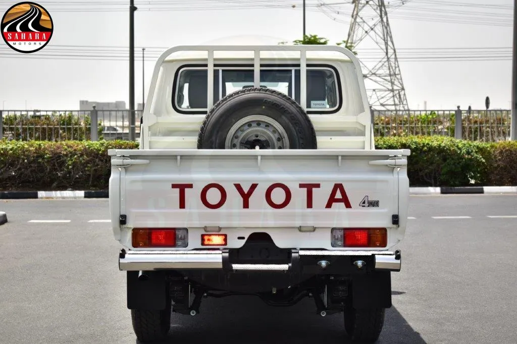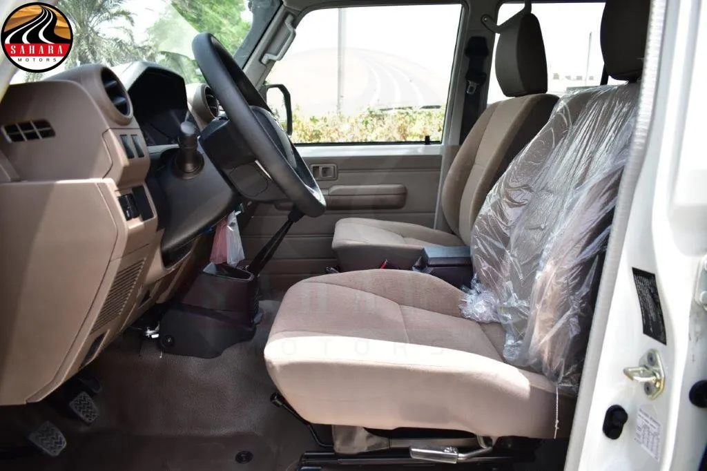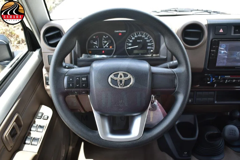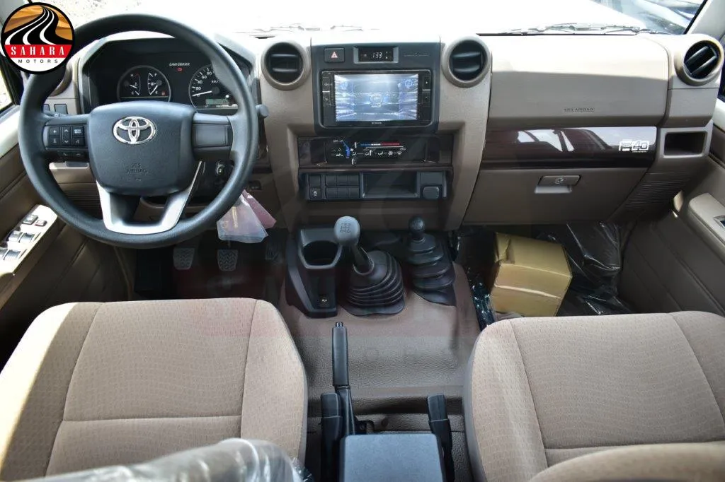 The 2025 Toyota Land Cruiser 79 Double Cab Pickup features front separate seats designed for comfort, along with a 130L fuel tank equipped with a lock for security. It includes a mist windshield wiper, halogen headlamps, and a day/night inner mirror. The vehicle boasts gray-painted wheel rims, a manual antenna, and meter illumination control for enhanced visibility. Practicality is emphasized with power door locks, power steering with tilt and telescopic adjustments, and power windows. A black radiator grille and black outer mirrors add to its rugged aesthetic, while rear fog lamps and a sliding rear glass enhance functionality. The transverse rear seating accommodates up to five passengers, with seat belts for safety. The green laminated windshield glass, safety kit, and rear bumper step further emphasize the vehicle's readiness for both everyday use and adventurous outings.