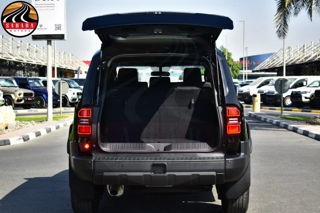 The 2026 Toyota Prado TXL features a rugged and distinctive exterior design. It rides on 18-inch alloy wheels and is equipped with LED headlights with a rectangular shape, as well as LED daytime running lights and front fog lamps. The front grille is finished in a silver tone, while the side mirrors with turn signal lamps and the door handles are body-colored. The Prado TXL also comes with a power-retractable side mirror, a pintle hook, and mud guards for enhanced off-road capability. For added convenience, the vehicle has a power back door with a back door glass open function. Completing the exterior is a rear spoiler and roof rails for increased utility and versatility.