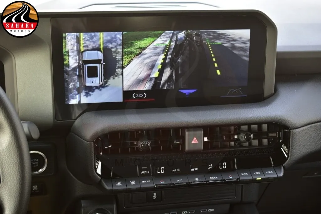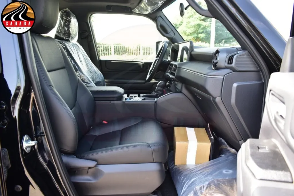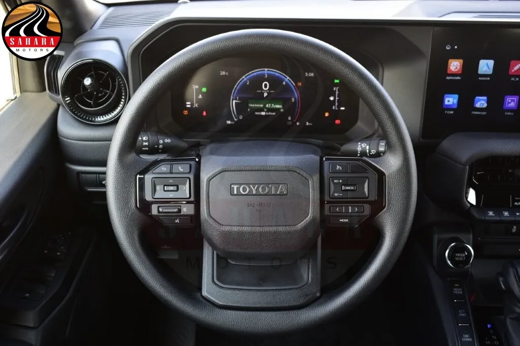 Inside the 2026 Toyota Prado TXL, the cabin is equipped with high-quality synthetic leather upholstery. The driver's seat is powered for easy adjustability, and both front seats feature ventilation and heating functions for maximum comfort. The steering wheel and shift knob are wrapped in leather, and the steering wheel comes with integrated controls. The Prado TXL is equipped with a 7-inch multi-information display and dual-zone automatic climate control for the front and rear passengers. For convenience, the vehicle has automatic power windows for all doors, sun visors with illuminated vanity mirrors, and a tonneau cover. The centerpiece of the interior is the 12.3-inch display audio system, which offers Apple CarPlay connectivity and is paired with a 6-speaker audio setup. Connectivity is further enhanced with the inclusion of USB-C and HDMI ports.