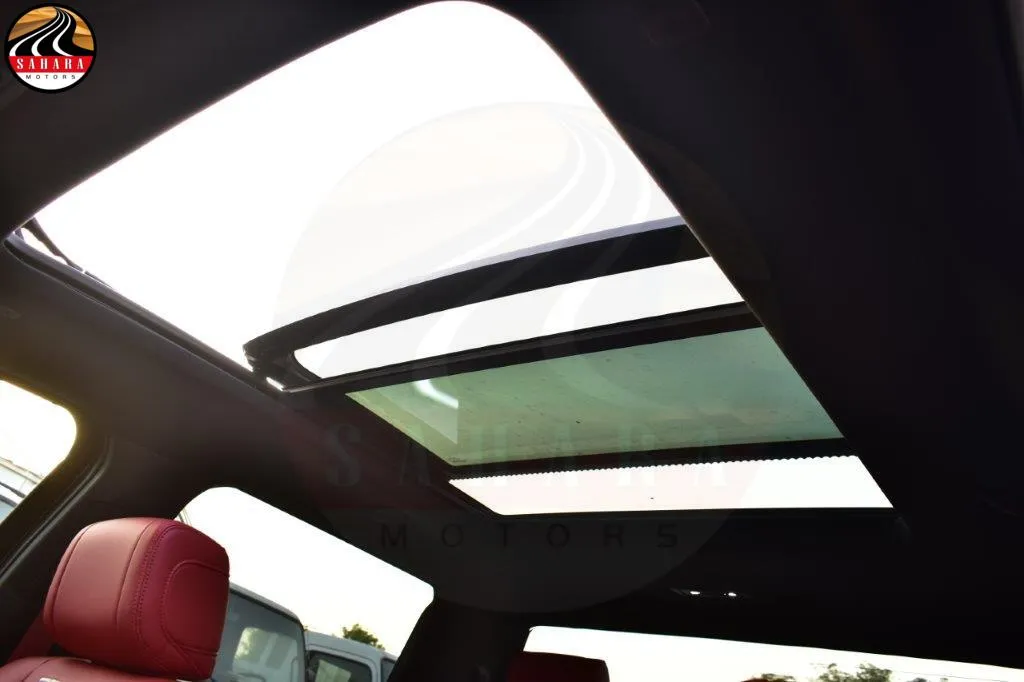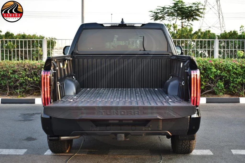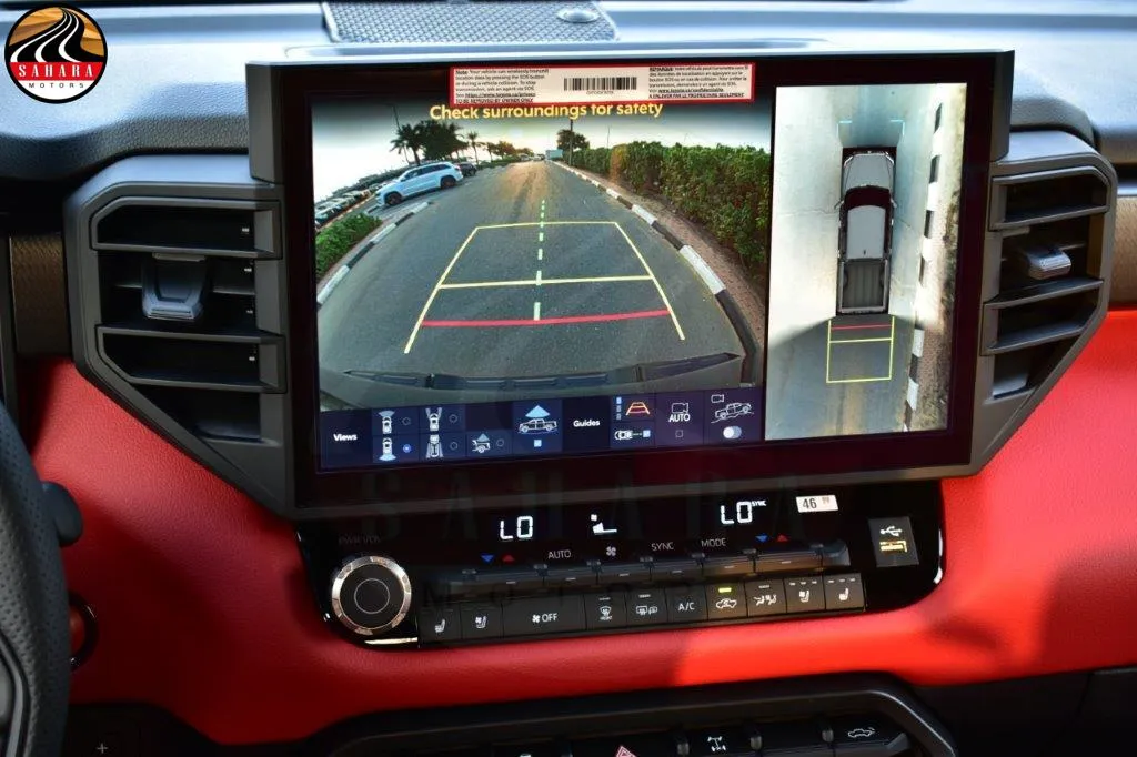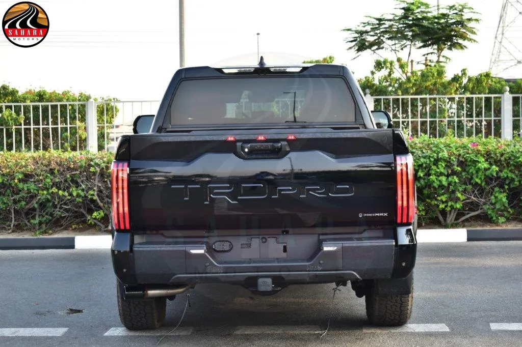 The truck also boasts 18-inch TRD Pro black forged BBS® wheels and P285/65R18 tires, ensuring a sturdy foothold on any surface. Additional features like amber marker lights, a TRD skid plate, and dual exhaust with the TRD logo enhance both functionality and aesthetics. Inside, the Tundra offers ample space with front headroom of 998 mm (39.3 in.) and rear headroom of 937 mm (36.9 in.), ensuring comfort for all passengers. The interior features are complemented by the TRD Pro logo and technical camo pattern inserts on the front seats, creating a rugged yet stylish cabin environment.