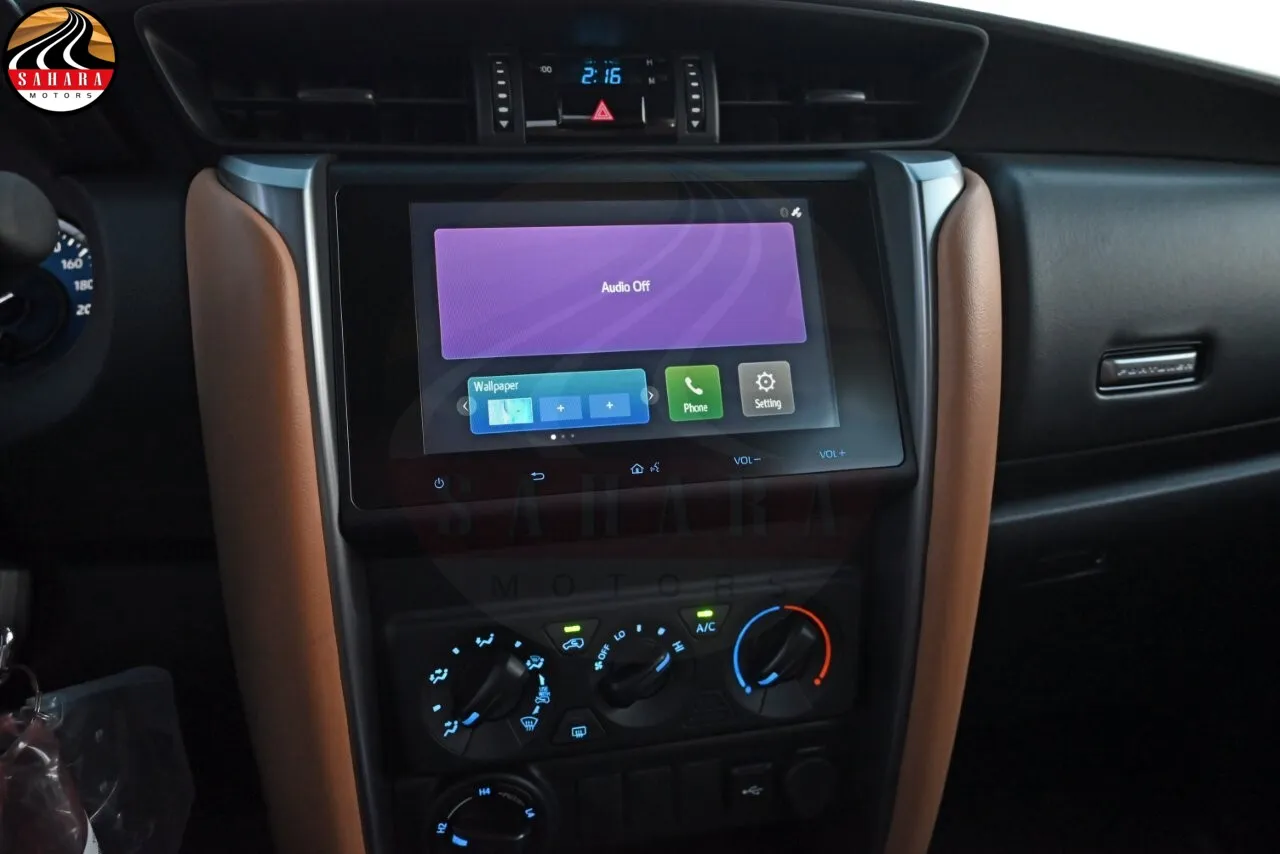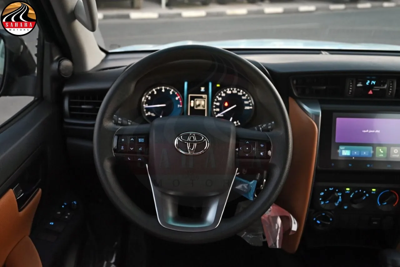 The interior of the 2026 Toyota Fortuner EXR is thoughtfully designed for comfort and convenience, featuring fabric seats that provide a cozy atmosphere. The driver's seat offers a vertical adjustment for personalized comfort, complemented by a telescopic steering wheel that ensures optimal positioning. Steering wheel controls enhance accessibility to essential functions, while the multi-information display keeps the driver informed. Security is prioritized with a front passenger door lock, and the rear dual USB Type-C power socket serves as a fast charger for devices. The audio and entertainment system includes an 8-inch connected display audio touchscreen, Apple CarPlay compatibility, digital audio broadcasting (DAB) radio, and six speakers, making every journey enjoyable.