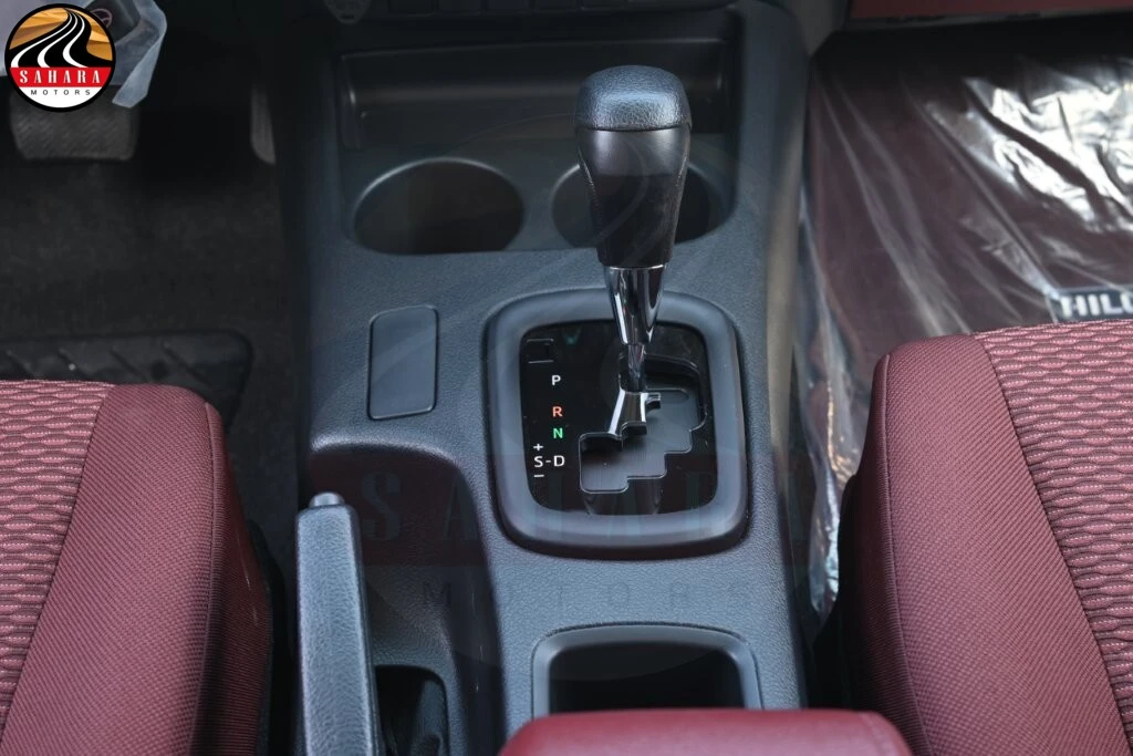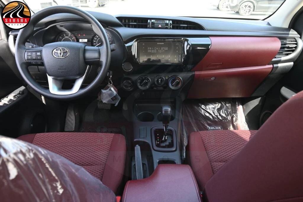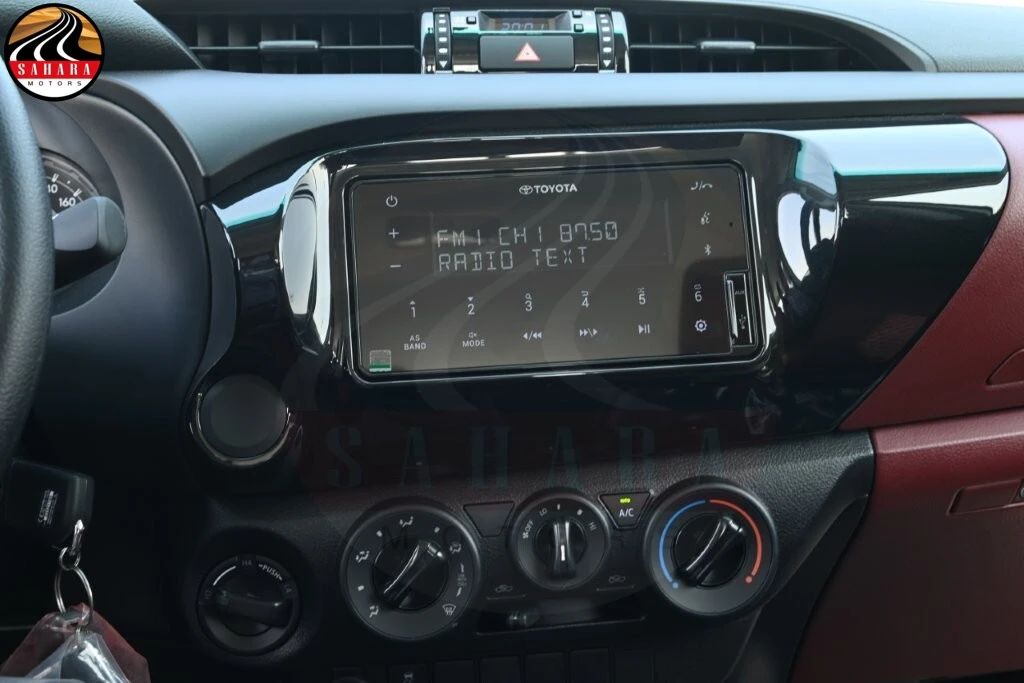 The Toyota Hilux Double Cab Pickup DLX-G (Model Code: GUN125L-DTTLXV) is powered by a 2.4L V4 engine featuring a 16-valve DOHC and dual VVT-i technology, paired with an automatic transmission for smooth driving. It boasts an 80L fuel tank capacity, ensuring long journeys are hassle-free. With seating for five, it combines comfort and practicality. The vehicle is equipped with ventilated disc brakes at the front and rear, while the suspension system includes a double-wishbone front and leaf springs with a rigid axle at the rear. The 4-spoke synthetic leather steering wheel features manual tilt adjustment, enhancing driver comfort. Safety is prioritized with ABS, VSC, HAC, TSC, and dual airbags for both driver and passenger. Additional features include power steering and a comprehensive audio system capable of AM/FM and DVD playback, making it a well-rounded choice for both work and leisure.