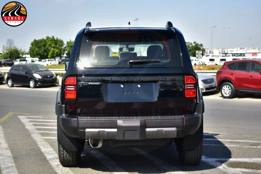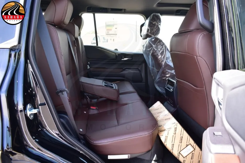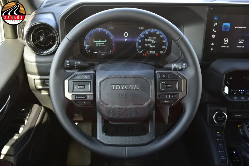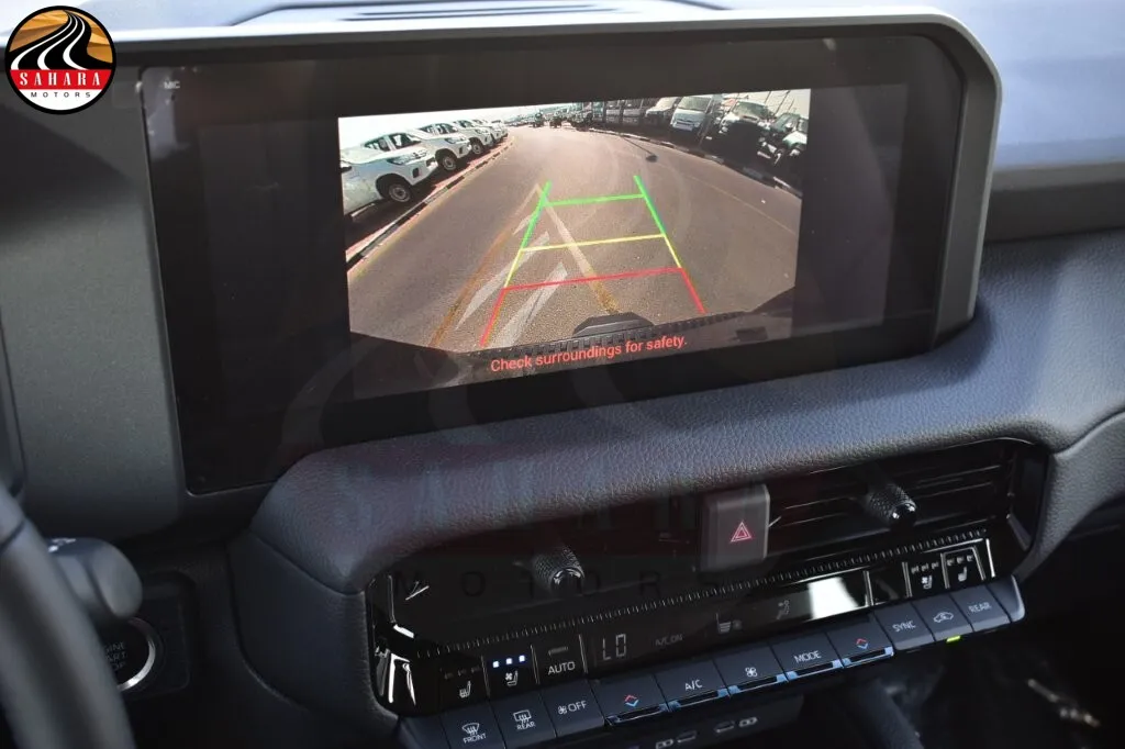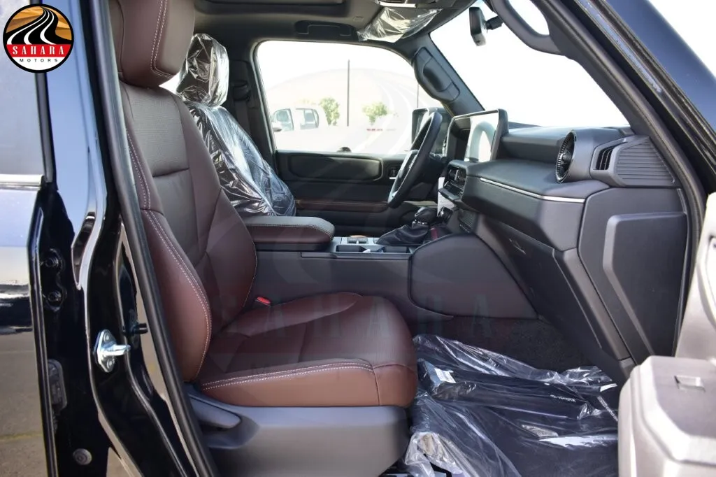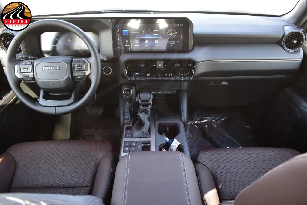 The interior of the 2026 Toyota Land Cruiser 250 Prado Adventure is designed for luxury and convenience, featuring premium leather seat material and powered front seats with a memory function for the driver. Both front and second-row seats offer ventilation and heating, while the power folding third-row seat enhances versatility. The leather-wrapped steering wheel and shift knob include paddle shift controls and various steering wheel controls, along with a heating feature for added comfort. A head-up display (HUD) and a rearview mirror with a camera provide modern touches, complemented by a fully digital 12.3-inch gauge cluster. The climate control system includes front dual automatic A/C and rear automatic A/C for optimal comfort. Additional features include sun visors with illuminated vanity mirrors, automatic power windows for all doors, and a tonneau cover.