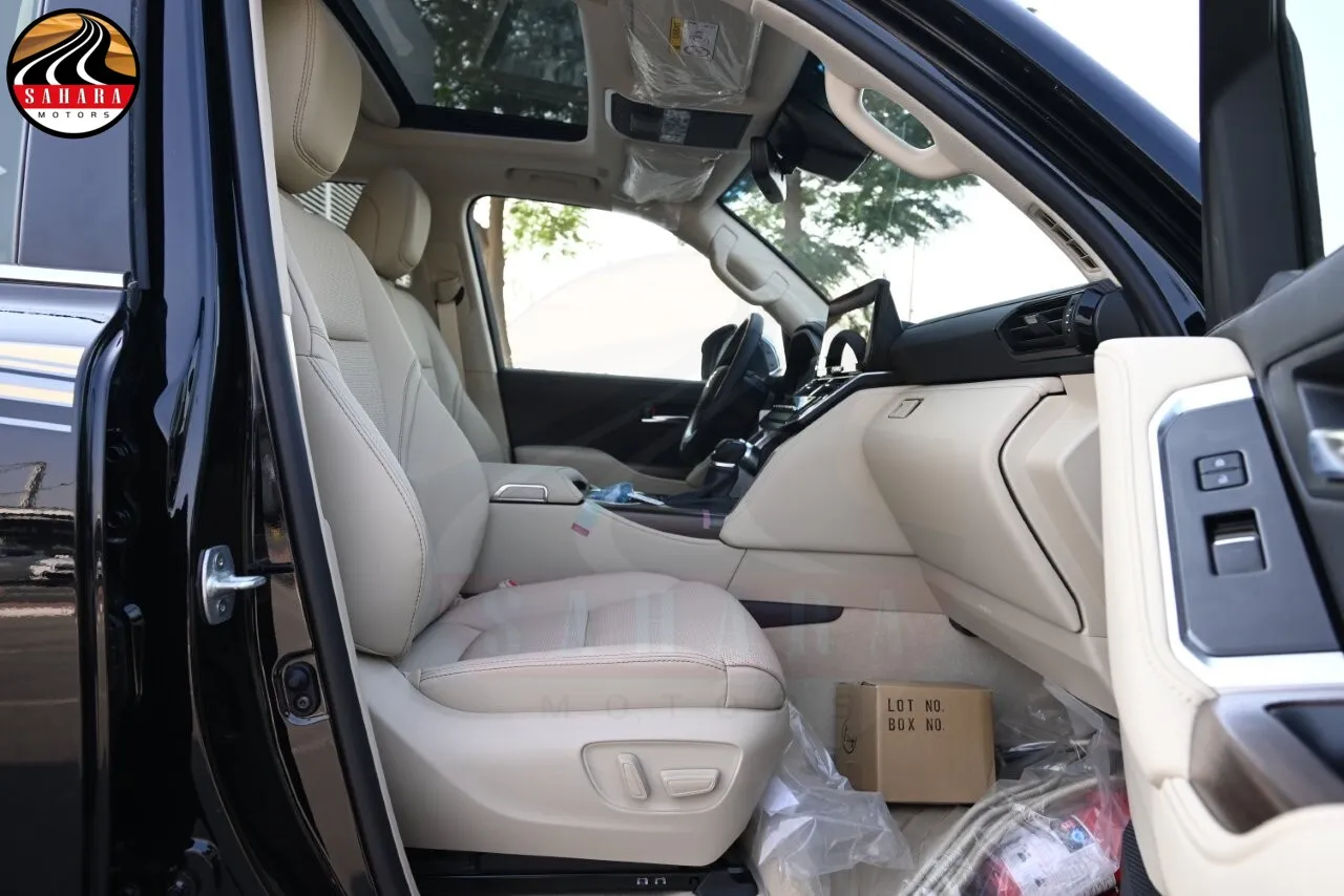 The 2026 Toyota Land Cruiser 300 VXR+ is equipped with advanced suspension featuring a double wishbone front and a 4-link rear setup for optimal ride quality. Safety is prioritized with a comprehensive suite of features including ABS, VSC, and various airbags, alongside cutting-edge technologies like Dynamic Radar Cruise Control and multiple terrain monitoring systems. Its luxurious interior embraces smooth leather seating for seven, a 12.3" multi-information display, and a 4-zone automatic climate control system. Additional amenities include a sun/moon roof, keyless entry, a premium 12.3" navigation system with 14 JBL speakers, and enhanced safety with electric parking brakes, parking sensors, and a panoramic view monitor. The exterior is marked by stylish details such as chrome accents, a high-mounted stop lamp, and advanced lighting with LED technology for superior visibility. Comfort features like power-adjustable seats with memory, illuminated entry systems, and a rear entertainment system round out this exceptional SUV, making it a luxurious and capable choice for any adventure.