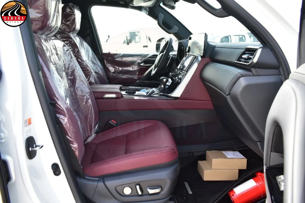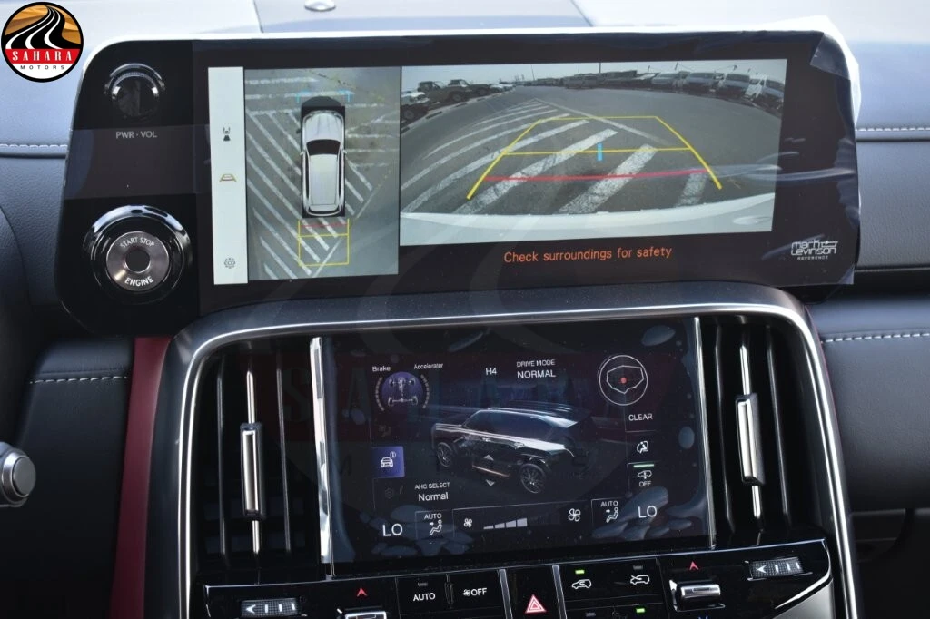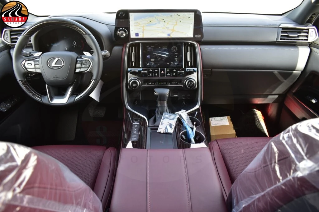 The 2026 Lexus LX600 Signature is equipped with the advanced Lexus Safety System 3.0, featuring a pre-crash system, adaptive cruise control, and lane tracing assist for enhanced safety on the road. It also includes a blind spot monitor with rear cross-traffic alert, ensuring comprehensive awareness of surroundings. The multi-terrain system, complete with crawl control, enhances off-road capabilities. Inside, the dual-display infotainment system combines a 12.3” main screen with a 7” auxiliary display, complemented by a Mark Levinson premium audio system featuring 25 speakers for an exceptional listening experience. Security is prioritized with an anti-theft system that includes an engine immobilizer, alarm, sensors, and fingerprint recognition. Additional luxury features include illuminated front door logos, a colored head-up display, a digital rearview mirror, and a kick sensor for easy tailgate access. For passenger enjoyment, there's a rear seat entertainment system with a cover, along with a remote engine starter for added convenience. The LX600 rides on 265/50R22 alloy wheels with a glossy finish, and a wireless charger is available for effortless device charging.