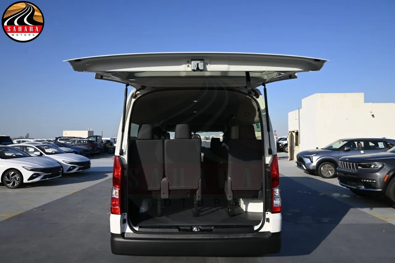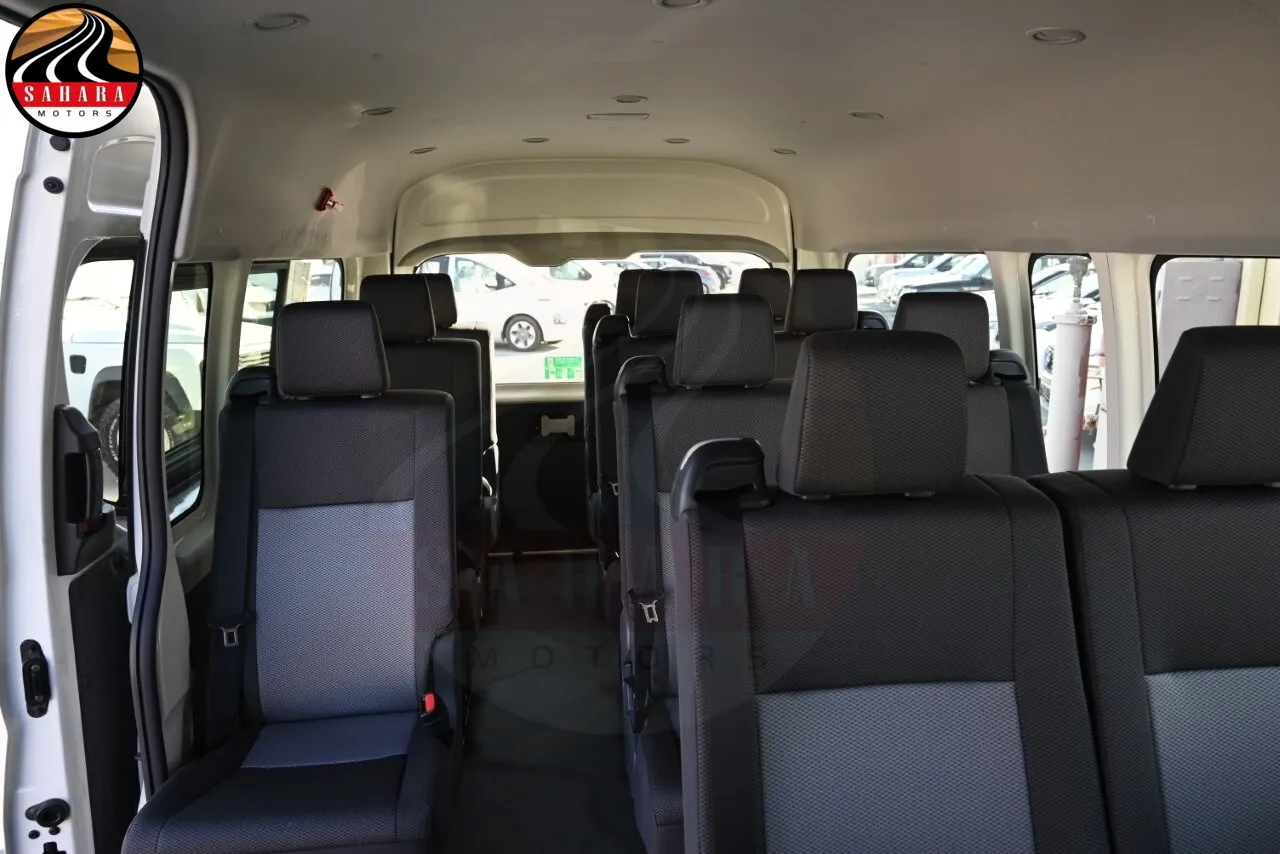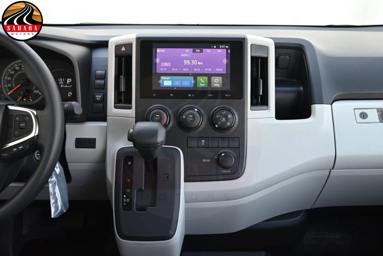 It includes advanced safety systems such as ABS, VSC, BA, ESS, TRC, and Auto LSD, complemented by dual front airbags. The stylish exterior features color-keyed bumpers and door handles, a chrome front grille, and halogen headlamps, while power-retractable mirrors enhance visibility.Inside, it comfortably seats up to 13 passengers with durable fabric and vinyl leather seats. Key features include an AC/heater system with rear controls, a day/night inner rearview mirror, and a multi-information display. Entertainment options consist of an AM/FM radio, rear USB ports, and a Bluetooth stereo system. Additional conveniences include keyless entry, a tire pressure monitoring system, and adjustable intermittent wipers, making the Hiace a reliable choice for families and commercial use.