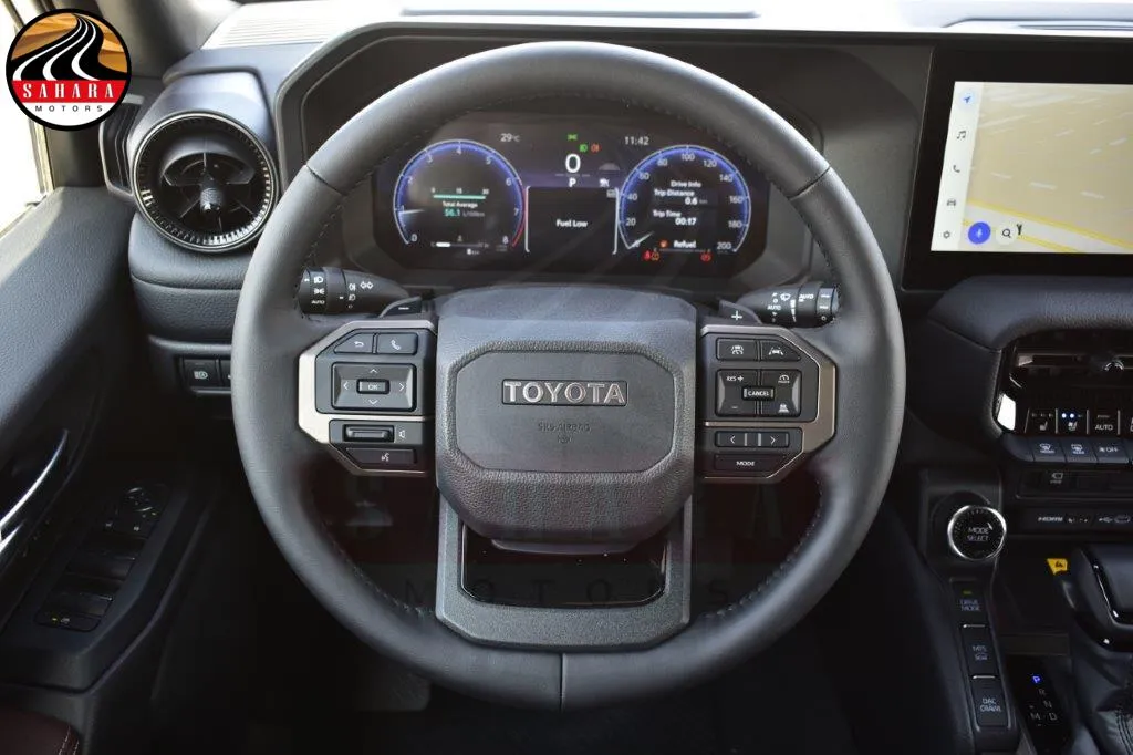 The 2024 Prado TXR boasts a host of premium exterior features, including LED headlights with daytime running lights and a headlight leveling system. It rides on 18-inch alloy wheels and features a silver front grille, while the front bumper guard is finished in black. The rear of the vehicle is enhanced with a silver back door garnish, and the Prado TXR is equipped with stylish side steps. For added convenience, the Prado TXR comes with smart keyless entry and power-operated, auto-retractable side mirrors. In terms of safety, the Prado TXR is equipped with a comprehensive suite of features, including dual-front, side, curtain, and knee airbags. It also features the Toyota Connect app, a rearview camera, LED front and rear fog lamps, and front and rear parking sensors.