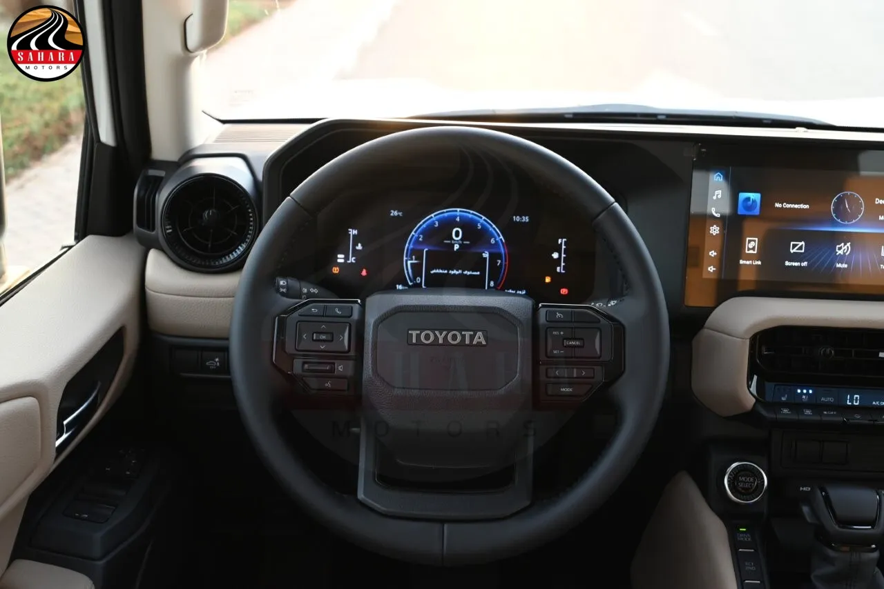 The 2026 Toyota Prado All-Rounder G features a well-appointed interior, highlighted by synthetic leather seat material and a powered driver's seat for optimal comfort. The front seats offer both ventilation and heating functions, complemented by a leather steering wheel and shift knob that include convenient steering wheel controls. A 7-inch multi-information display and a 12.3-inch display audio system provide essential information and entertainment options, including Apple CarPlay, along with USB-C and HDMI ports for connectivity. The climate control is optimized with front dual auto A/C and rear auto A/C to ensure passenger comfort. Sun visors with illuminated vanity mirrors add a touch of luxury, while automatic power windows for all doors and illuminated scuff plates enhance usability. Additionally, a tonneau cover is included for versatile cargo management, and a premium sound system with six speakers provides an enjoyable audio experience.