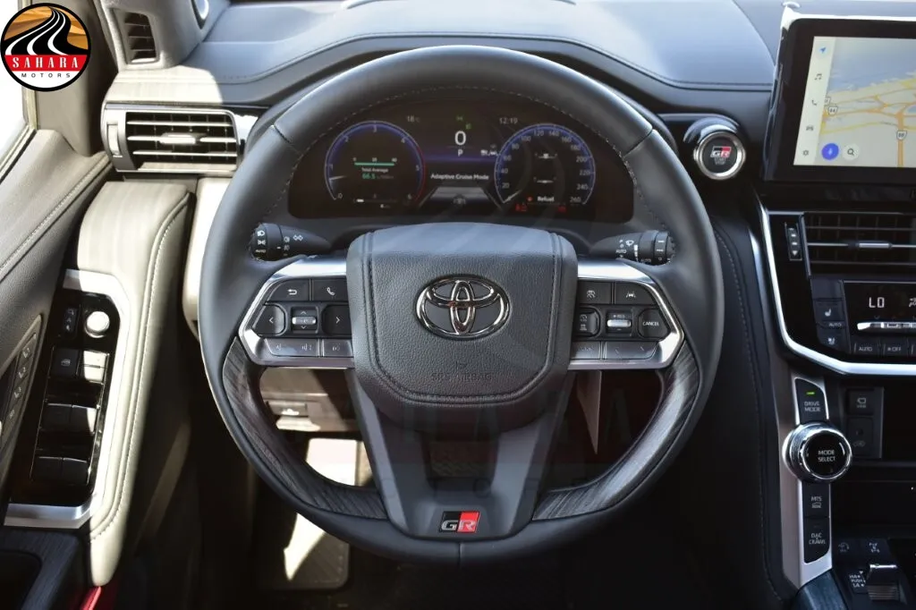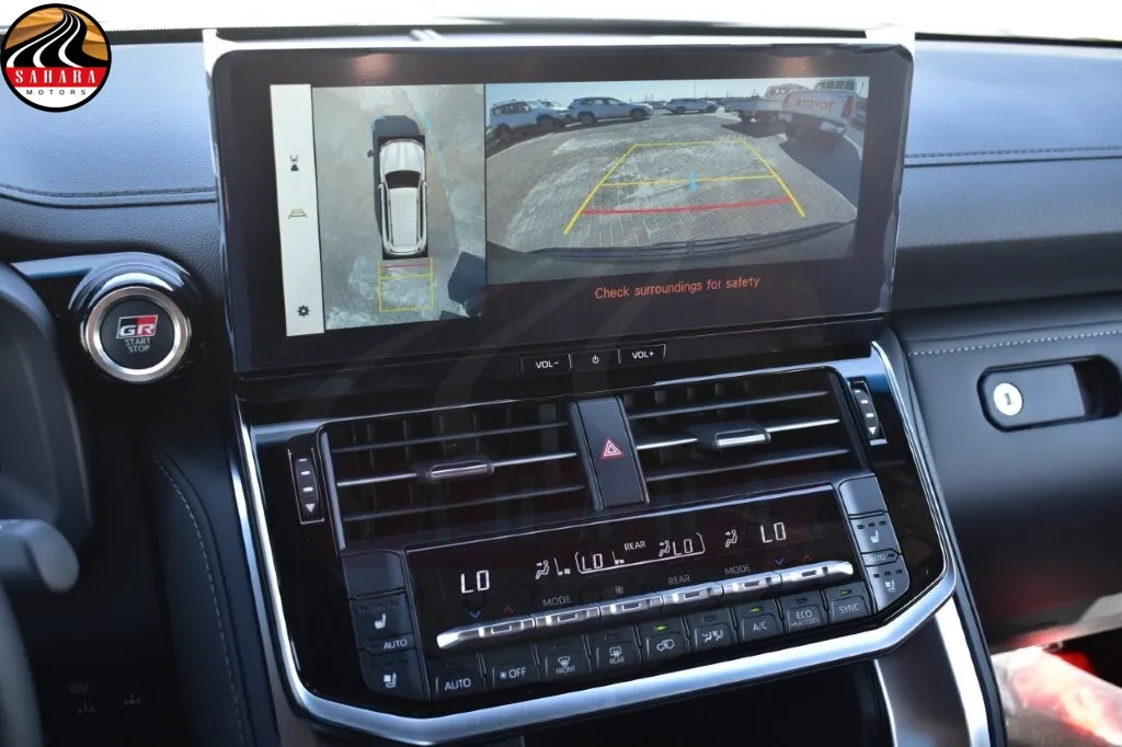 The 2026 Toyota Land Cruiser 300 GRS combines luxury and functionality with features like a green laminated windshield, a 12.3-inch multi-information display, and a synthetic leather console box with a rear AC vent. It offers five drive modes for a customizable driving experience, while the interior includes smooth leather seating for seven, power-adjustable front seats with memory, and a versatile second and third-row seating configuration. Additional highlights include a leather and wood steering wheel with integrated controls, 4-zone automatic climate control, keyless smart entry, and power windows, making it the ultimate SUV for comfort and convenience.