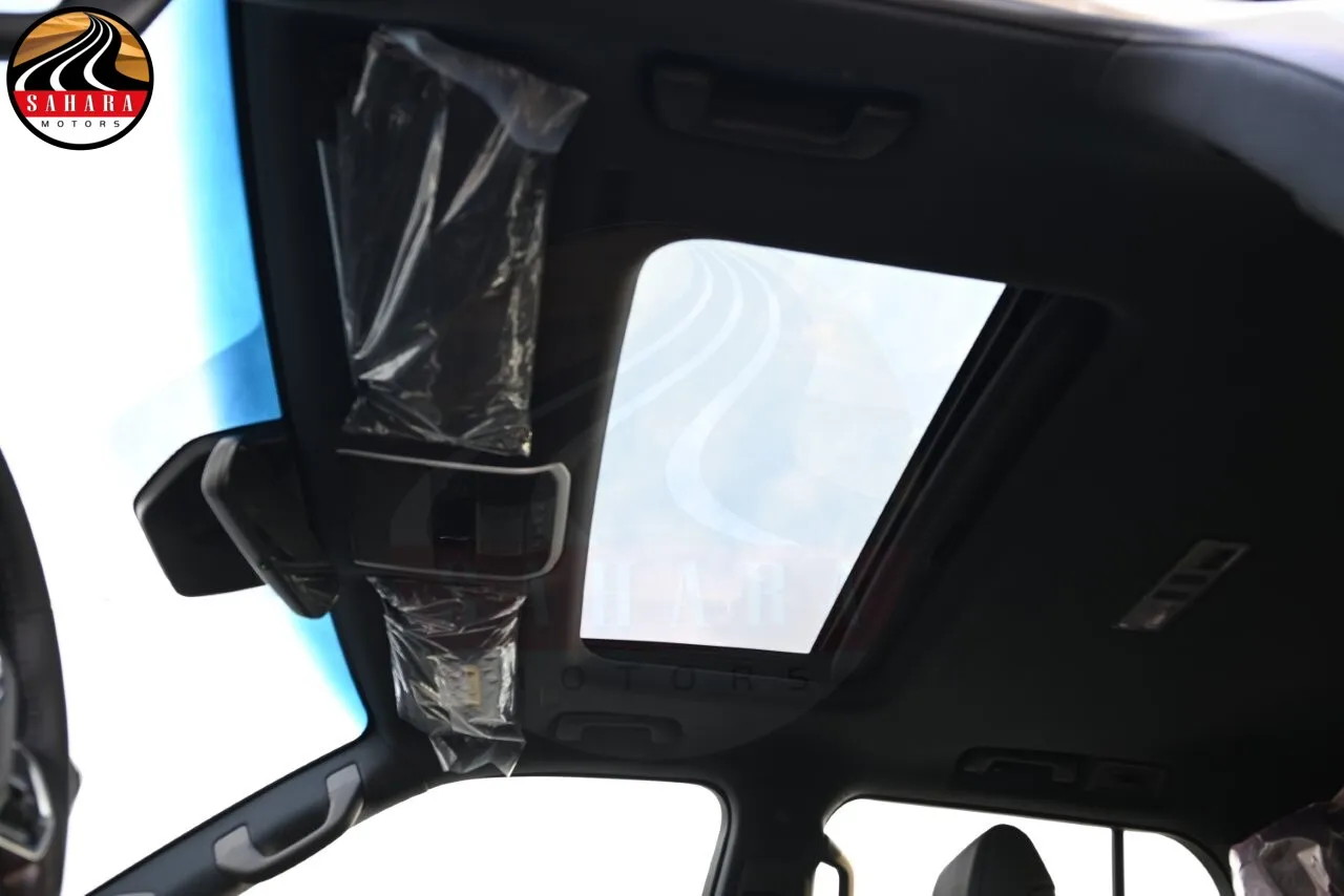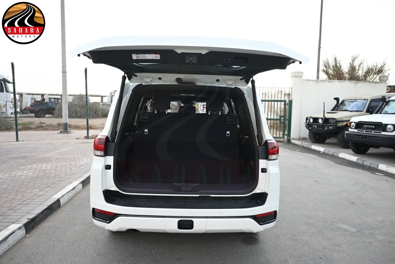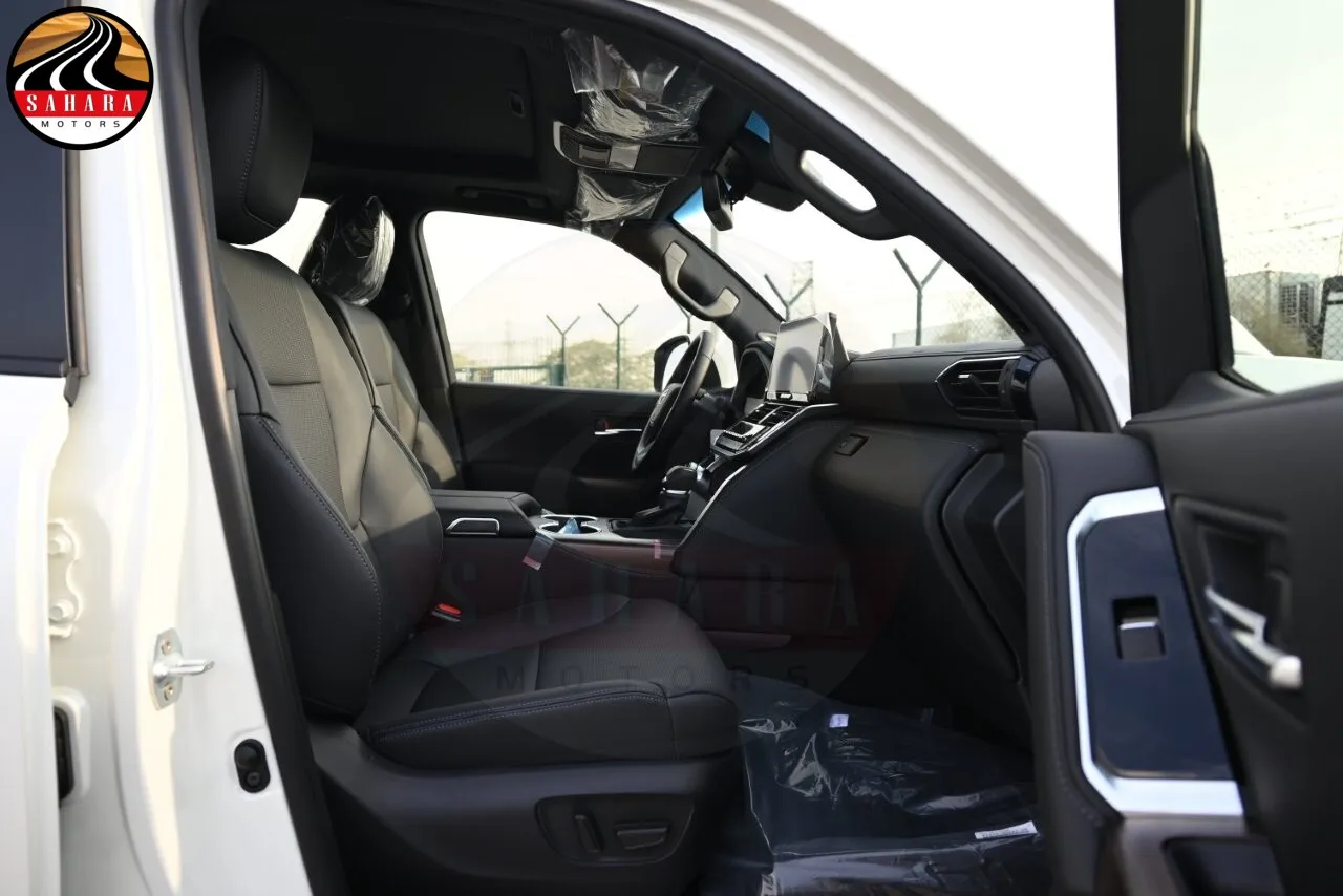 The 2026 Toyota Land Cruiser 300 GXR features a sophisticated audio system with a 12.5-inch display and 14 JBL speakers for an immersive listening experience, while the interior combines luxury with practicality through leather and imitation wood seating. The power-adjustable front seats offer lumbar support and ventilation, accommodating a total of seven passengers with the second-row seating including a center armrest and cup holders, and the third row designed for two. Comfort is enhanced by a dual-zone automatic air conditioning system and smart entry with push-button start. Additional conveniences include power windows, advanced wipers, a digital clock, and a center console with a cool box. The vehicle's design is completed with LED room lamps, body-colored bumpers, and mud guards, ensuring a stylish yet functional choice for families and adventurers alike.