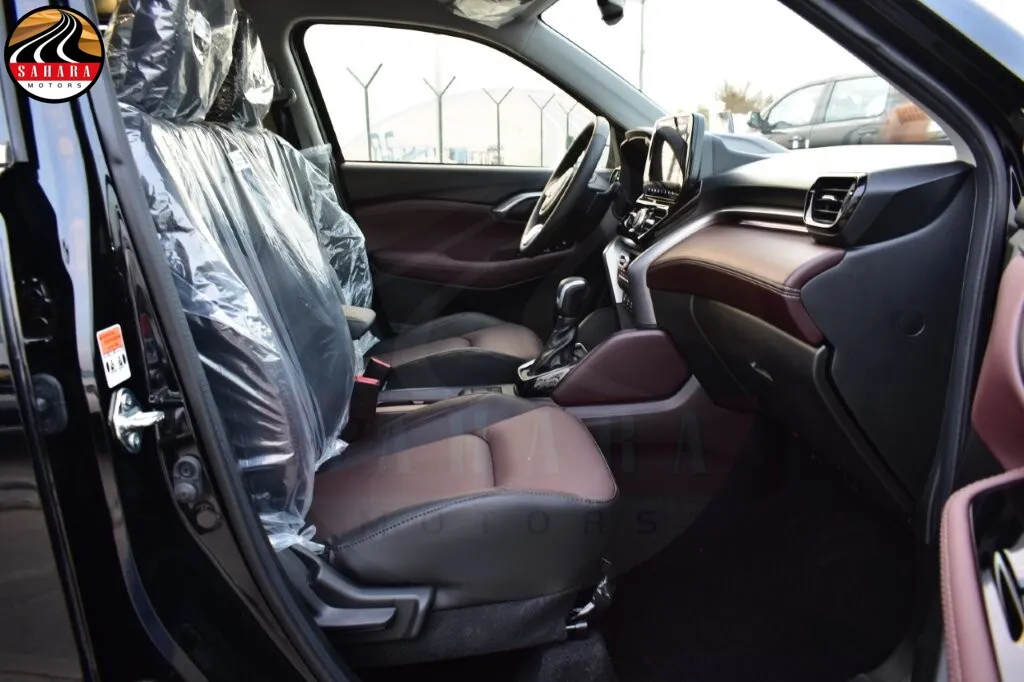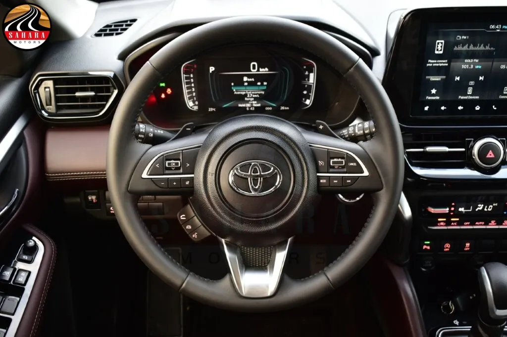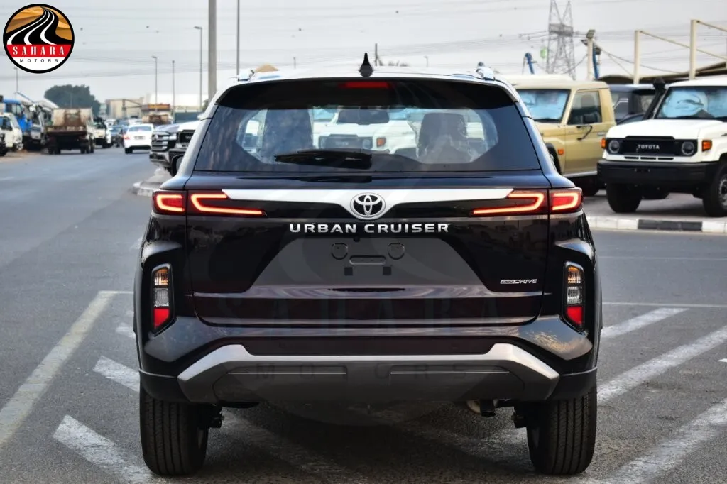 The 2026 Toyota Urban Cruiser GLX is a feature-rich vehicle boasting LED headlamps, LED rear lamps, and LED daytime running lights (DRL) for improved visibility. It includes a smart entry system, a panoramic moonroof, and auto retractable power side mirrors with turn signal lamps. Inside, the luxurious leather seats and leather steering wheel with controls enhance comfort, while the front automatic air conditioning and rear A/C duct ensure a pleasant environment. The dashboard features a 7-inch multi-information display and a 9-inch touch screen with wireless Apple CarPlay, complemented by USB charging options and a six-speaker audio system. Safety is prioritized with multiple airbags, an electric parking brake (EPB), anti-lock brake system (ABS), vehicle stability control (VSC), hill start assist (HAC), front and rear cross-traffic alerts, and a tire pressure monitoring system (TPMS). Additional technologies include a panoramic view monitor with four cameras, front and rear sensors, a head-up display, and a wireless smartphone charger, making every drive comfortable and secure.